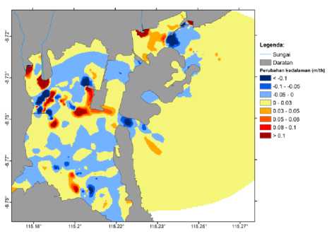 Perubahan kedalaman perairan di Teluk Benoa dapat dilihat pada Gambar 13. Pada daerah dekat dengan pelabuhan mengalami pendangkalan sekiar 0,03 sampai melebihi dari 0,1 m/tahun, selain itu beberapa daerah yang dekat dengan sungai juga mengalami pendangkalan yang tinggi yaitu melebihi dari 0,1 m/tahun dengan pendangkalan maksimum yaitu 0,53 m/tahun dan rata-rata pendangkalan adalah 0,0048 m/tahun