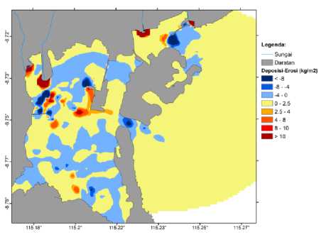 Selain pendangkalan, beberapa daerah junga mengalami pendalaman yaitu daerah pada bagian dekat dengan Sungai Buaji dan Loloan serta pada mulut teluk. Menurut penelitian Leys and Mulligan (2011), perubahan kedalaman pada perairan diakibatkan karena proses deposisi dan erosi yang terjadi di perairan tersebut. Dilihat dari selisih antara deposisi dan erosi seperti Gambar 14, pola pendangkalan di Teluk Benoa memiliki kemiripan sehingga dapat menujukkan pengaruh