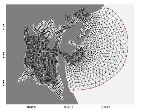 Grid tak-terstruktur dengan resolusi 50 - 500 m (resolusi yang dimaksud merupakan jarak antara 2 node terdekat) seperti Gambar 2 |