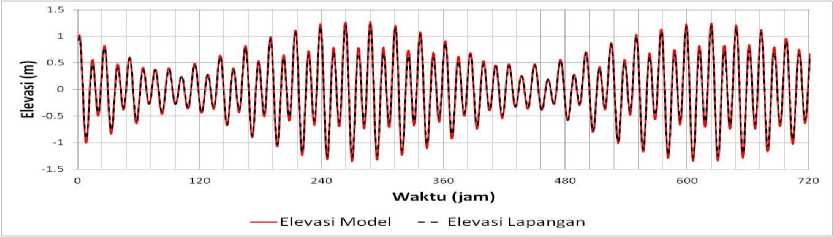 Validasi dari hasil model perlu dilakukan dalam suatu pemodelaan numerik agar dapat diketahui sejauh mana penyimpangan dari hasil simulasi model yang telah dilakukan terhadap data lapangan. Berdasarkan Gambar 6 menunjukkan bahwa secara umum data elevasi hasil model dan data lapangan memiliki pola yang sama dengan korelasi yang tinggi yaitu 0,99. Perhitungan secara kuantitatif menggunakan RMSE menghasilkan perbedaan antara hasil model dan observasi lapangan sebesar 0,05 m.