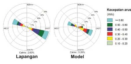Berdasarkan current rose seperti Gambar 7 menunjukkan pola pergerakan arus hasil pengukuran di lapangan dan simulasi model di Mulut Teluk Benoa memiliki pola yang serupa, dimana arus dominan bergerak ke arah timur