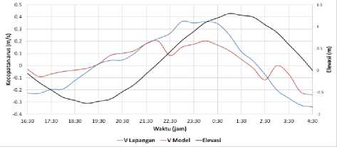 Validasi arus juga dilakukan dengan membandingkan komponen kecepatan arus U (Gambar 8) dan V (Gambar 9) antara hasil simulasi model dan observasi lapangan. Validasi dari komponen U menujukkan pola yang serupa dengan korelasi yang tinggi yaitu 0,99 dan RMSE sebesar 0,06 m/s. Sedangkan pada komponen kecepatan arus V memiliki sedikit perbedaan dengan korelasi yang tinggi yaitu 0,9 dan RMSE sebesar 0,13 m/s. Menurut penelitian yang dilakukan Al Tanto (2017) perbedaan kecepatan arus pada komponen V di Teluk Benoa dapat diakibatkan karena adanya gangguan dari aktivitas lalu lintas kapal pada lokasi pengambilan data lapangan.