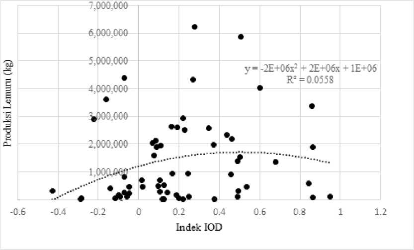Berdasarkan Gambar 5, hubungan IOD dengan produksi ikan lemuru di perairan Selat Bali, diperoleh persamaan regresi polinomial y = (-2E + 06x2) + (2E + 06x) + (1E + 06) dengan nilai koefisien determinasi (R2) sebesar 0.0558. Hasil tersebut menunjukkan bahwa besar keterkaitan antara indeks IOD dengan produksi ikan lemuru di perairan Selat Bali yaitu 5.58%. Nilai koefisien korelasi yang diperoleh yaitu sebesar 0.1740 (berbanding lurus) yang berarti hubungan indeks IOD dengan produksi ikan lemuru di perairan Selat Bali hanya sebesar 17.40 % dengan pengaruh positif (berbanding lurus) dimana pada saat terjadinya fenomena IOD positif maka akan diikuti dengan meningkatnya produksi ikan lemuru atau saat terjadinya fenomena IOD negatif maka akan diikuti dengan menurunnya produksi ikan lemuru.
