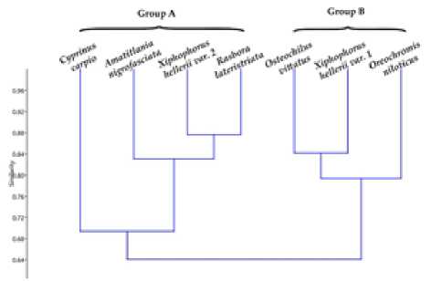 Xiphophorus hellerii var. 1 have a similarity value of 84%; Oreochromis niloticus and Osteochilus vittatus, Xiphophorus hellerii var. 1 of 79%. The similarity value between group A and group B of 64%. Fish that has the highest similarity value is Xiphophorus hellerii var. 2 and Rasbora lateristriata. While the lowest similarity value is group A and group B.