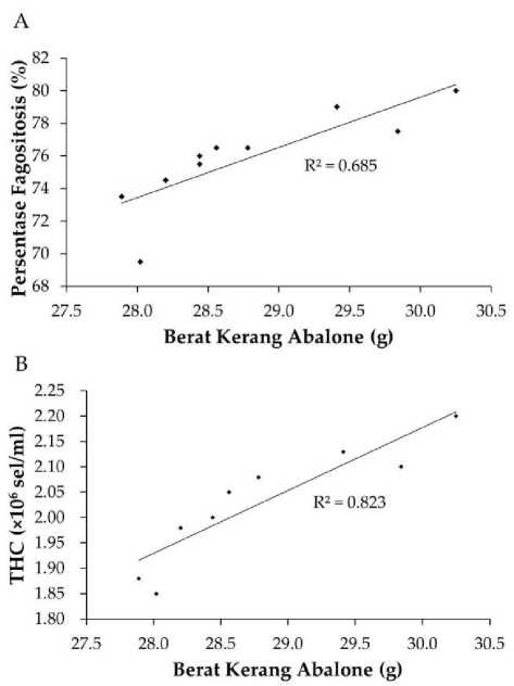 Hasil analisa menunjukkan bahwa terdapat hubungan antara berat Kerang Abalone dengan persentase fagositosis (R2=0,685) dan jumlah total hemosit (R2=0,823) (Gambar 1). Hal ini menunjukkan bahwa semakin berat Kerang Abalone maka akan memiliki tingkat kekebalan tubuh/kesehatan yang lebih baik.