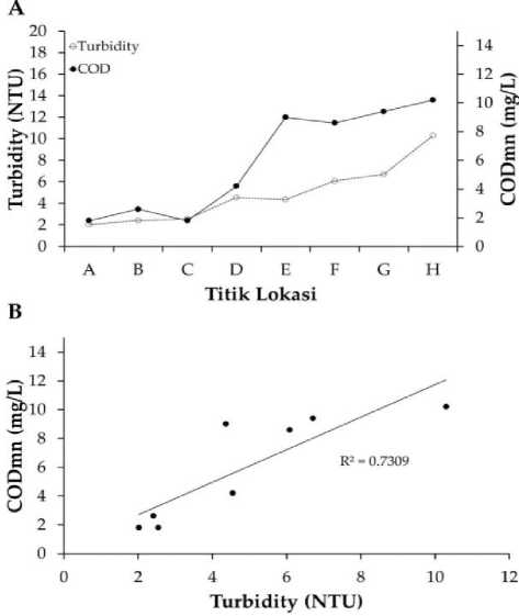 Hasil pengamatan menunjukkan bahwa seiring dengan kenaikan turbidity air, diikuti dengan kenaikan COD air (Gambar 1A). Terdapat korelasi positif antara turbidity dan COD air (R2 = 0,7309) (Gambar 1B). Kenaikan turbidity dan COD secara tajam ditunjukkan pada titik D, E, dan F, menunjukkan tingginya input material tersuspensi di lokasi itu.