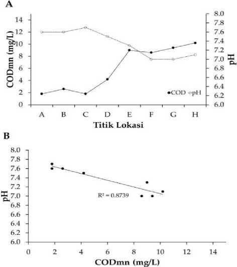 Hasil analisa menunjukkan bahwa terjadi penurunan pH seiring dengan kenaikan COD pada air sungai (Gambar 2A), dan keterkaitan yang erat (R2 = 0,8739) (Gambar 2B). Hal ini sesuai dengan dugaan bahwa tingginya kebutuhan oksigen kimiawi menunjukkan tingginya kandungan material organik/anorganik yang ada di dalam air. Tingginya konsumsi oksigen tersebut terkait dengan kenaikan produk respirasi berupa CO2 (Wu et al., 2007). Salah satu penyebab penurunan pH air adalah kuantitas gas CO2 di dalam air yang kemudian akan menghasilkan ion hidrogen (H+) dan bikarbonat (HCO3) (Talling, 2010; Raju et al.,2014). Mekanisme penurunan pH air terjadi melalui reaksi antara karbondioksida (CO2) dan air (H2O) yang kemudian menghasilkan asam bikarbonat (H2CO3). Reaksi itu kemudian berlanjut dengan menghasilkan ion hidrogen (H+) dan bikarbonat (HCO3) (Nguyen et al., 2008; Hirshberg dan Gerber, 2016).