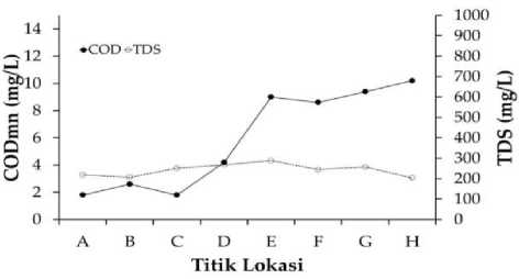 Total dissolved solid (TDS) merepresentasikan keseluruhan padatan terlarut berupa mineral yang ada di dalam air (Islam et al., 2016). Mineralmineral di dalam air sungai bisa disebabkan karena 2 faktor, yaitu input mineral dari luar (Anhwange et al., 2012; Carlson, 2014) dan produk dari dokomposisi bahan organik yang ada pada air sungai tersebut (Wu dan Maskaly, 2018). Titik A, B, C, dan D (Kota Batu dan Malang bagian barat) masih menunjukkan tingkat dekomposisi seimbang, tetapi pola yang sama tidak terlihat pada titik E, F, G, dan H (Kota Malang). Kenaikan nilai COD pada air sungai di wilayah Kota Malang tidak diikuti dengan kenaikan TDS airnya, yang mengindikasikan bahwa kandungan bahan organik pada level tertentu tidak dapat diubah dikonversikan menjadi senyawa inorganik karena terbatasnya kemampuan air sungai untuk melakukan proses sirkulasi material (organic menjadi anorganik). Berdasarkan hasil ini dapat