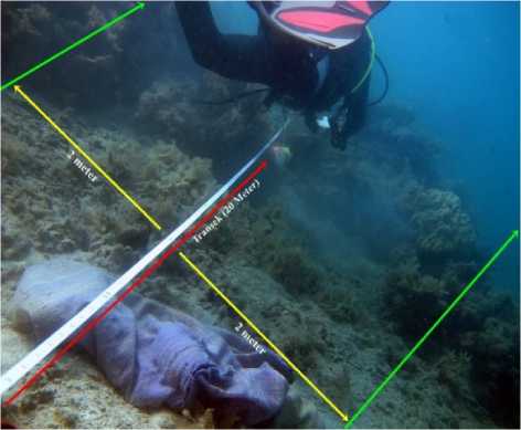 Pengambilan data mengikuti panduan pemantauan sampah laut menurut Galgani et al. (2013). Penelitian diawali dengan melakukan penilaian awal dengan melakukan selam permukaan atau snorkeling untuk menentukan ukuran transek. Panjang dan lebar transek ditentukan berdasarkan kepadatan sampah laut di suatu wilayah (Galgani et al., 2013; Lippiatt et al., 2013). Ukuran panjang dan lebar transek yang digunakan yaitu 20 m x 4 m (Gambar 1), kemudian setiap titik lokasi pengambilan data dilakukan pengulangan sebanyak 4 kali dengan jarak 5 meter pada setiap ulangannya.