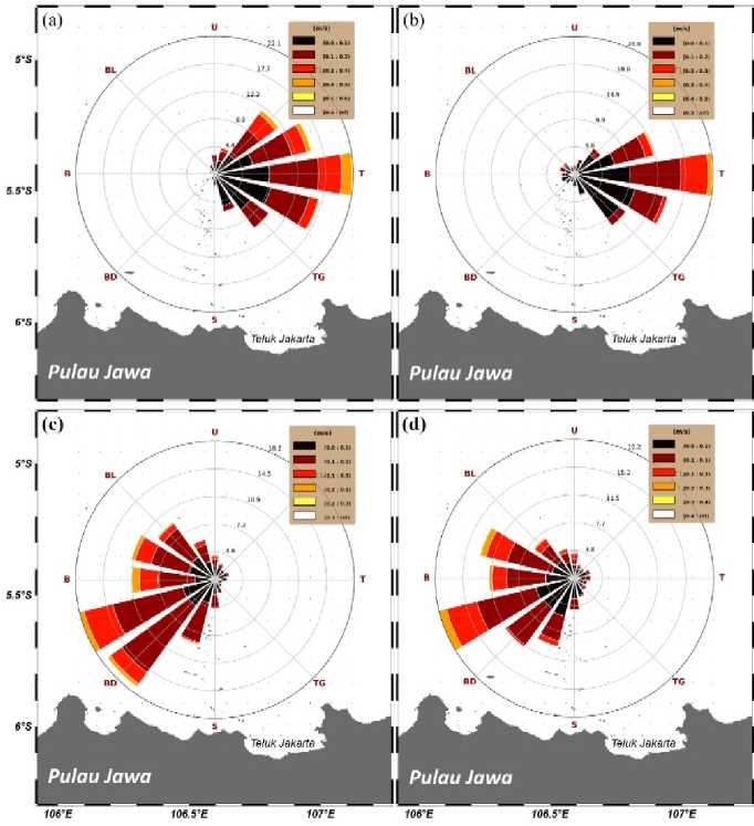 Musim timur dan musim peralihan II menunjukkan pola yang berbeda. Kedua musim ini memiliki arah dominan dari timur menuju barat dengan variasi arah barat daya – barat laut. Musim barat memiliki arah yang lebih dominan menuju barat daya dan musim peralihan II memiliki arah yang lebih menyebar antara barat daya – barat laut (Gambar 2). Hal ini disebabkan karena pada bulan Juni sampai November di belahan bumi bagian utara bertiup Angin Muson Tenggara yang mengakibatkan angin permukaan bergerak ke arah barat (Wyrtki, 1961).