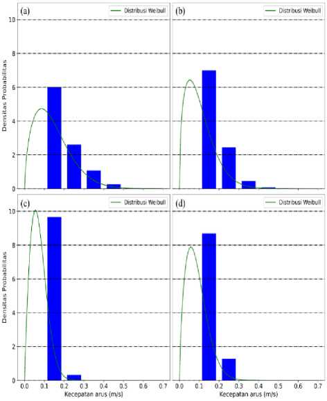 Kategori arus lemah di lokasi memiliki hubungan yang cukup erat dengan musim angin timur. Musim timur angin yang bergerak dari benua Australia ke benua Asia yang memiliki kelembaban udara yang rendah (udara kering). Berdasarkan fungsi densitas probabilitas terhadap kecepatan arus (Gambar 3), pada musim timur kecepatan arus didominasi angin yang memiliki kecepatan rendah dengan nilai tertinggi pada kisaran kecepatan arus 0.1 – 0.2 m/s. Musim barat dan musim peralihan I memiliki nilai kecepetan angin yang yang lebih besar dibandingkan pada musim timur dan musim peralihan II.