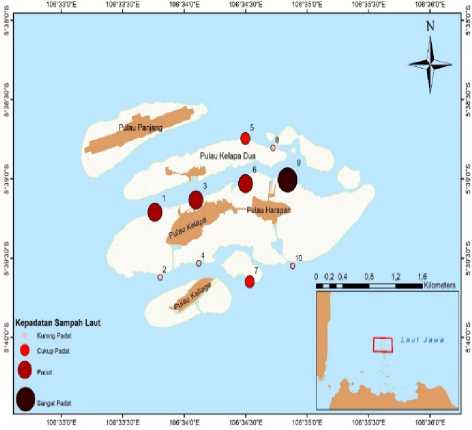 Terdapat 4 kategori kepadatan sampah laut di lokasi penelitian yaitu sangat padat, padat, cukup padat, dan kurang padat. Peta kepadatan tersebut didapat berdasarkan perbandingan kepadatan sampah laut antar stasiun, sehingga kepadatan yang didapat merupakan kepadatan relatif antar stasiun penelitian. Hasil penelitian menunjukan stasiun 1, 3, 6, dan 9 memiliki kepadatan yang lebih tinggi dibandingkan dengan stasiun lainnya. Pada lokasi tersebut merupakan pelabuhan yang menyambungkan Pulau Kelapa Dua dan Pulau Kelapa, selain itu lokasi ini juga digunakan oleh warga sebagai salah satu lokasi utama yang digunakan oleh warga untuk mengangkut barang keperluan harian yang dibeli di daratan utama atau kota Jakarta. Jarak perumahan warga dengan tubir terbilang cukup dekat dibandingkan stasiun lainnya, hamparan karang atau pasir terbilang