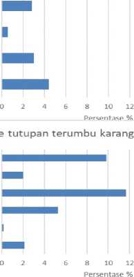Hasil penelitian menunjukan secara berurutan dari stasiun 1 hingga 9 tutupan terumbu karang berada pada nilai 21,6%; 14%; 19,4%; 10,82%; 14,1%; 23,8%; 24,5%; 21,6%; 31,1%; 19,1%. nilai tutupan terumbu karang paling tinggi berada di stasiun 9 dengan nilai persentase sebesar 31,1% yang termasuk dalam kategori sedang. Nilai tutupan paling rendah berada di stasiun 4 dengan nilai persentase sebesar 10,82%.