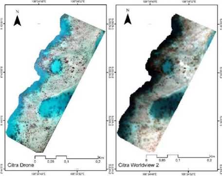 Perbedaan objek pada citra foto udara dan citra Worldview-2 dapat dilihat secara visual. Perbedaan dari ke 2 citra tersebut terjadi karena adanya perbedaan tingkat resolusi spasial antara citra drone dan citra Worldview-2. Penggunaan drone dalam melakukan pemetaan terumbu karang mampu menghasilkan citra foto udara beresolusi tinggi sehingga visualisasi objek perbedaan tingkat pertumbuhan dan sebaran karang terlihat dengan sangat jelas.