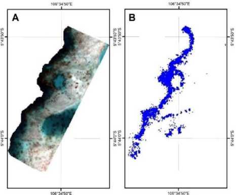 Berdasarkan Gambar 6, hasil klasifikasi citra Worldview-2 dengan algoritma Maximum Likelihood Classification menghasilkan kelas sebaran tutupan terumbu karang. Algoritma ini mengelompokan pixel citra yang belum diketahui identitasnya berdasarkan vektor rata – rata dan matriks ragam dari setiap pola spektral kelas informasi. Pixel citra dimasukan menjadi salah satu kelas yang memiliki probabilitas (peluang) paling tinggi (Richards, 2013). Warna biru pada Gambar 6 menjelaskan pola sebaran distribusi terumbu karang pada area penelitian yang didominasi oleh