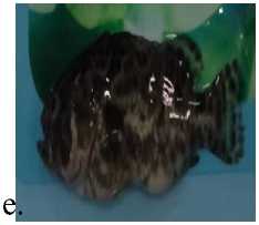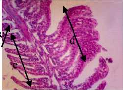 Gambar 4. Struktur Jaringan Insang Ikan Kerapu Cantang (Epinephelus fuscoguttatus lanceolatus). Keterangan: D: Hemoragi Lamella (a) dan Sel Radang (b) (100x), P1: Congesti Lamella Sekunder (c), Sel Radang Lamella Primer (b) dan Hemoragi Lamella Sekunder (a) (100x), P2: Congesti Lamella Primer (c) dan Adesi (d) dan Hemoragi Lamella Sekunder (a) (100x), P3: Congesti Lamella Primer (c), Adesi Lamella Sekunder (d) dan Lamella Sekunder Normal (e) (100x).