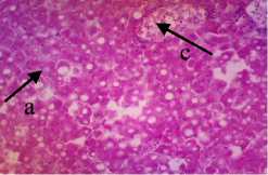 Gambar 5. Struktur Jaringan Hati Ikan Kerapu Cantang (Epinephelus fuscoguttatus x Epinephelus lanceolatus) Keterangan: D: Degenerasi Vakuola (a) (100x), P1: Degenerasi Vakuola (a) (100x), P2: Degenerasi Vakuola (a) dan Nekrosis Sel Hati (b) (100x), P3: Degenerasi Vakuola (a) dan Congesti (c) (100x)