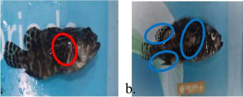 mengalami luka pada bagian kepala, punggung dan perut, tidak memiliki nafsu makan, peroduksi lendir berlebih dan warna tubuh pucat. Pemberian ekstrak P. australis dengan dosis 0,5% belum adanya nafsu makan, produksi lendir berkurang, warna tubuh tampak normal dan masih minimnya pergerakkan. Sedangkan pada pemberian ekstrak P. australis dengan dosis 1% dan 1,5% memiliki persamaan perubahan yaitu ikan sudah cepat merespon makan, tidak adanya lendir pada wadah, tidak ada luka pada tubuh dan pergerakan kembali lincah. Gambaran morfologi ikan kerapu cantang setelah diberi perlakuan dapat dilihat pada Gambar 1.