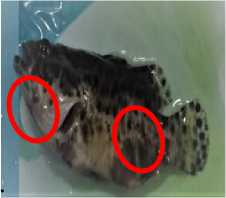 Gambar 2. Morfologi ikan kerapu cantang pada setiap perlakuan. Keterangan: a. Ikan normal (o: Operkulum normal, tidak ada luka, warna tubuh normal), b. Terpapar deterjen (o: terdapat luka pada operkulum, badan dan perut), c. Pemberian P. australis 0,5% (o: operkulum mengalami perubahan warna, warna tubuh tampak normal), d. Pemberian P. australis 1% (o: operkulum dan pangkal ekor mengalami proses pengembalian warna), e. Pemberian P. australis 1,5% (kulit kembali normal dan tidak ada luka).