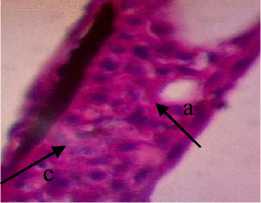 Gambar 3. Struktur Jaringan Kulit Ikan Kerapu Cantang (Epinephelus fuscoguttatus lanceolatus). Keterangan: D: Degenerasi Vakuola (a) (400x), P1: Degenerasi Vakuola (a) dan Hiperplasia (b) (400x), P2: Degenerasi Vakuola (a) (400x), P3: Degenerasi Vakuola (a) dan Sel Radang (c) (400x).