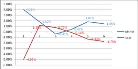 Gambar 1 menampilkan pola pergerakan return abnormal portofolio winner maupun portofolio loser. Notasi pengamatan adalah sebagai berikut: 1 = perioda formasi; 2 = pengujian 6 bulan; 3 = pengujian 1 tahun; 4 = pengujian 1,5 tahun; 5 = pengujian 2 tahun; dan 6 = pengujian 2,5 tahun.