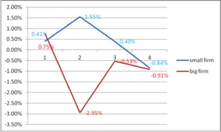 Gambar 2 menampilkan pola pergerakan return abnormal portofolio saham loser yang dibagi menjadi dua sub-kelompok: portofolio loser yang memiliki ukuran perusahaan kecil (small firm) dan portofolio loser yang memiliki ukuran perusahaan besar (big firm).