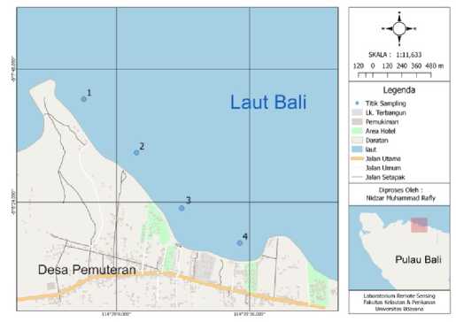 Pengambilan data ikan corallivor dan herbivor serta rugositas terumbu karang dilakukan pada tanggal 21 - 26 Maret 2018. Lokasi pengambilan data dilakukan di Perairan Pemuteran, Kecamatan Gerokgak, Kabupaten Buleleng, Bali (Gambar 1).