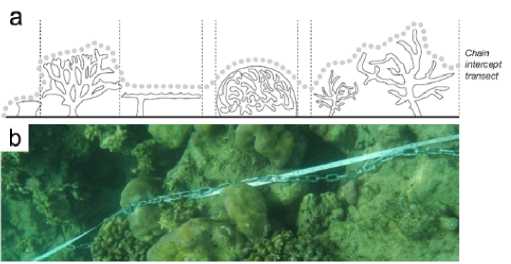 Nilai rugositas terumbu karang dilakukan pengamatan menggunakan metode transek rantai (chain intercept transect) (Hill and Wilkinson, 2004). Pengambilan data rugositas terumbu karang dilakukan dengan meletakkan rantai besi dengan diameter ukuran 66 mm sepanjang 20 m mengikuti kontur terumbu karang (Hill and Wilkinson, 2004). Skema transek ditunjukkan pada Gambar 3