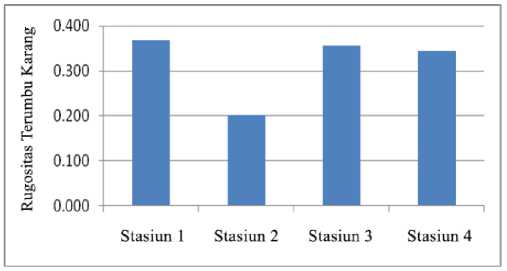 Hasil pengukuran nilai rugositas terumbu karang pada masing-masing stasiun berkisar antara 0.203-0.398 dengan nilai rugositas terumbu karang terendah pada stasiun 2 sedangkan nilai rugositas terumbu karang tertinggi pada stasiun 1 (Gambar 4). Tingginya nilai rugositas terumbu karang disebabkan oleh tingginya tutupan karang jenis massive yang berukuran besar. Rendahnya rugositas pada stasiun 2 dikarenakan kondisi kontur dasar terumbu karang didominasi oleh karang jenis massive yang berukuran kecil dengan jarak yang berjauhan sehingga tidak menimbulkan lekukan kontur dasar yang tinggi.