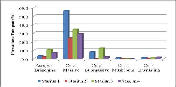 Penentuan stasiun penelitian ditentukan dengan menggunakan metode purposive sampling dimana terdapat 4 stasiun penelitian dengan masing-masing 3 ulangan transek. Posisi transek mengikuti garis pantai pada kedalaman 5-6 meter dan jarak antar stasiun ±500 m. Luasan terumbu karang tidak sama di setiap stasiun sehingga ukuran luas stasiun mengikuti ukuran luas terumbu karang.