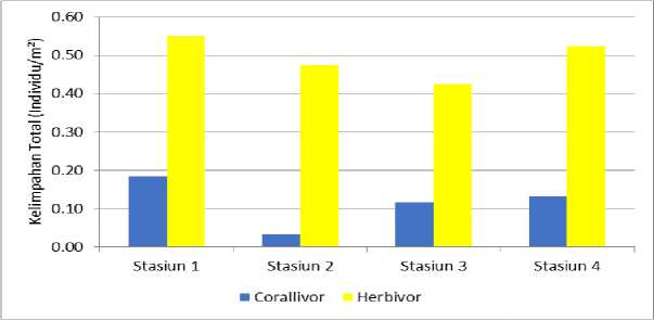 Kelimpahan total ikan herbivor tertinggi terdapat pada stasiun 1 sebesar 0.55 dan terendah terdapat pada stasiun 3 dengan nilai 0.43 (Gambar 3). Ikan jenis Plectroglyphidodon lacrymatus merupakan ikan dengan kelimpahan yang paling tinggi sedangkan ikan jenis Ctenochaetus striatus merupakan ikan dengan kelimpahan terendah. Kelimpahan total ikan herbivor didominasi oleh famili Pomacentridae yang melimpah dan terdapat di semua stasiun hal tersebut dikarenakan famili tersebut bersifat teritorial, relatif stabil, dan dapat dijumpai mulai dari daerah pasang surut hingga mencapai kedalaman 40 m (Sugianti dan Mujiyanto, 2013).