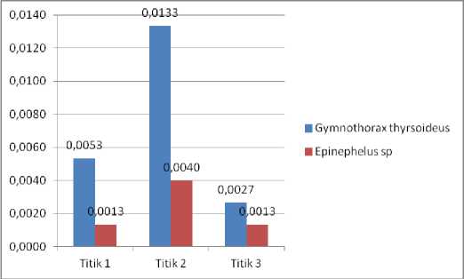 Pada penelitian ini data yang dihasilkan berupa data kelimpahan rata-rata predator abalon Haliotis squamata pada daerah transek. Dari hasil ketiga titik tersebut hanya dua jenis yang dapat dikategorikan sebagai predator yakni Gymnhotorax thyrsoideus dan Epinephelus sp. Pada titik yang pertama menunjukan data kelimpahan yakni sebesar 0,0053 individu/m2 untuk jenis Gymnhotorax thyrsoideus dan untuk jenis Epinephelus sp memiliki nilai sebesar 0,0013 individu/m2. Pada titik 2 Gymnhotorax thyrsoideus memiliki nilai 0,0133 individu/m2 dan Epinephelus sp memiliki nilai 0,040 individu/m2. Pada titik 3 Gymnhotorax thyrsoideus memiliki nilai 0,027 individu/m2 dan Epinephelus sp memiliki nilai 0,0013 individu/m2. Hal tersebut menjadikan titik 2 sebagai nilai kelimpahan predator abalon yang paling tertinggi. Hal tersebut dikarenakan daerah tersebut merupakan daerah terumbu karang yang merupakan daerah habitat ikan-ikan dan organisme lainnya. Predator yang paling terendah ada pada titik 3. Hal ini diduga karena pada titik tersebut memiliki daerah yang jauh dengan ekosistem terumbu karang. Hal tersebut diperkuat dengan pernyataan Rani (2003) bahwa terumbu karang memberikan beberapa fungsi ekologi terhadap biota laut (ikan dan invertebrata), yaitu sebagai daerah pemijahan, daerah pembesaran, dan daerah mencari makan.