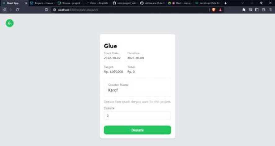 5. Jika pengguna menekan tombol Donate pada salah satu proyek yang di dalam tabel maka akan dialihkan ke halaman donate yang untuk melakukan input berupa angka.