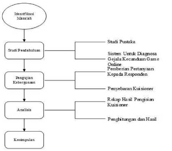 Dalam tahap penelitian ini Langkah pertama yang dilakukan adalah identifikasi masalah, dilanjutkan dengan studi pendahuluan. Selanjutnya pengujian terhadap kebergunaan sistem yang dibangun menggunakan google form terhadap para pengguna game online. Langkah berikutnya analisis di mana analisis digunakan untuk mengetahui hasil yang didapat dari kuisioner yang sudah disebar.