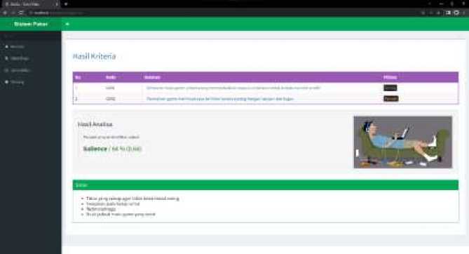 Hasil diagnosa merupakan hasil kondisi final yang didapat oleh user. Sehingga user mengetahui kondisi yang dialami. Bisa dilihat pada gambar 6:
