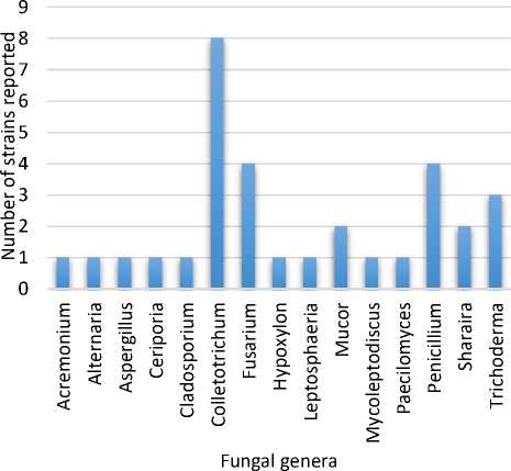 In this review, thirty-two endophytic fungal strains from fifteen fungal genera isolated from host plants, H. serrata, Phlegmariurus phlegmaria, and Phlegmariurus taxifolius were reported capable of producing Hup A (Table 1). Among these genera, endophytic fungal strains belonging to Colletotrichum, Fusarium and Penicillium were frequently reported as producers of Hup A (Figure 1), as shown in Figure 2.
