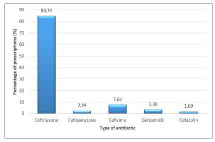 Based on Table 2, successively from most to least prescribed antibiotics were ceftriaxone (84.74%) at doses of 1 and 2 grams; cefixime (7.62%) at doses of 100 and 200 mg; gentamicin (3.38%) doses of 40 and 80 mg; cefoperazone (2.54%) doses of 1 and 2 grams; and cefazoline (1.69%) at a dose of 1 gram. Antibiotic therapy for orthopaedic surgery is generally cephalosporin group, and if the patient is allergic to this group, gentamicin can be used. Cephalosporins are broadspectrum antibiotics that work by inhibiting bacterial cell wall synthesis.