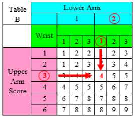 represent the level of posture loading of the musculoskeletal system in relation to the combination of body part postures. The sum of the load score with the score of table A produces a score of A. While the sum of the coupling score with the posture score of table B produces a score B. Then the score A and score B are used to read table C which finally gets the score C. Finally the C score is summed up with the activity score the final score is the R.E.B.A value.