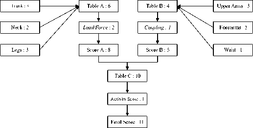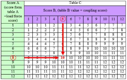 Step 4 Calculate the score for each angle, load, and activity. This stage aims to combine the C score and the activity score into a single grand score that can provide guidance on the priority of subsequent investigations. Each possible combination of C scores and activity scores has been given a rating, called the grand score from 1 to 11+ based on estimated risk of injury associated with musculoskeletal loading.