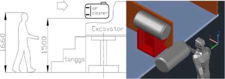With the software to model it in a real way, the appropriate tools are designed to improve the work posture. The average height of the operator at the air cleaner assembly station is 166 cm while the position of the installation of the air cleaner is at 155 cm. The operator needs to climb the stairs and then install the sambal to hold the component weight.