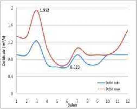 Sungai Tiying Tali adalah saluran intake dari Bendungan Tiying Tali yang menjadi saluran irigasi. Dengan menggunakan data dari Dinas PU Kabupaten Buleleng berupa laporan pengukuran debit air yang masuk ke intake Bendung Tiying Tali selama tahun 2012 diperoleh fluktuasi debit maksimum dan debit minimum tiap bulan seperti ditunjukkan oleh Gambar 2 [10]. Debit terendah terjadi bulan juni dengan dengan besar 0,623 m3/s dan tertinggi terjadi pada bulan maret sebesar 1,952 m3/s.