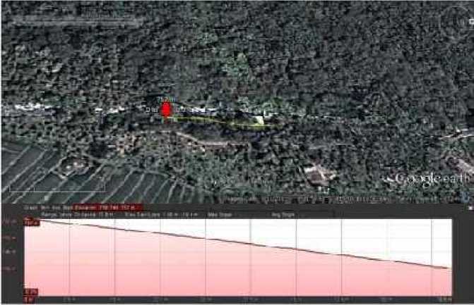 Di Sungai Tiying Tali terdapat terjunan air yang cukup tinggi. Terjunan ini pula dimanfaatkan pada PLTMH Cahaya Abadi. Tinggi terjunan dihitung dengan menggunakan GPS dan Google Earth. GPS digunakan untuk mencatat titik kordinat letak kolam penenang dan rumah daya, kordinat ditunjukan oleh tabel 2. Titik kordinat diunggah ke Google Earth untuk mendapatkan citra satelit lokasi tersebut. Kedua titik kordinat dihubungkan dengan sebuah garis. Garis tersebut mewakili jalur dari pipa pesat. Dengan menggunakan fasilitas yang dimiliki oleh Google Earth diperoleh Tinggi Permukaan Laut (TPL) masing-masing titik kordinat.dan kontur tanah di sepanjang garis yang menghubungkan kedua kordinat tersebut. seperti ditunjukkan Gambar 3. Head diperoleh dari pengurangan TPL tertinggi dengan TPL, yaitu: