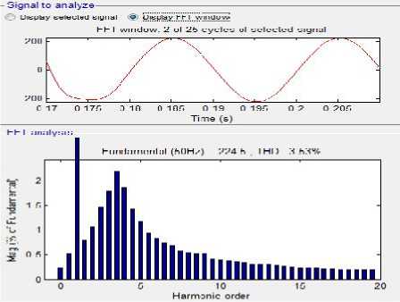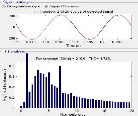 Gambar 7. Sinyal dan spektrum tegangan harmonisa menggunakan filter aktif