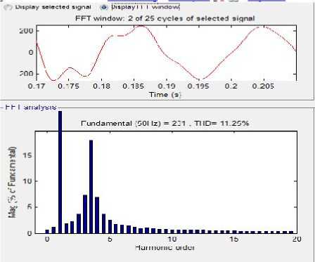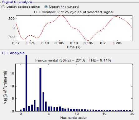 Gambar 9. Sinyal dan spektrum tegangan harmonisa menggunakan filter hybrid shunt