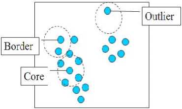 Neighborhood yang terletak di dalam radius ( ∈ ) disebut ∈ -neighorhood dari objek data. Jika ∈ -neighborhood dari suatu objek berisi paling sedikit suatu angka yang minimum, MinPts dari suatu objek, objek tersebut disebut core object. Neighborhood dari border points berisi jauh lebih sedikit items daripada neighborhood dari core points. Suatu border point bisa jadi termasuk ke dalam lebih dari 1 core object. Berikut ini gambar yang menunjukkan mana yang merupakan border point dan mana yang merupakan core point contoh dengan menggunakan MinPts=5 dan Eps=1.