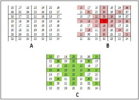 Gambar 8 A, B dan C adalah salah satu contoh yang bisa mengilustrasikan cara sistem untuk mendapatkan nilai akurasi yang direpresentasikan dengan kotak-kotak dengan berisi nilai setiap pixel, sebagai contoh mengitung nilai akurasi dimulai dengan menentukan point awal secara acak dalam hal ini dipakai nilai pixel di tengah-tengah citra sebagai