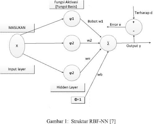 RBF-NN (φ) merupakan fungsi dengan keluaran yang simetris terhadap center (c) tertentu atau dinyatakan sebagai φ = φ ||x - c||, dimana || . || merupakan vektor normal. Fungsi yang digunakan misalnya Gaussian, Multiquadric, Inverse Quadratic, Inverse Multiquadric, dll. Jaringan RBF terdiri atas tiga layer yaitu layer input, hidden layer dan layer output. Struktur dasar jaringan RBF-NN ditunjukkan pada Gambar 1.