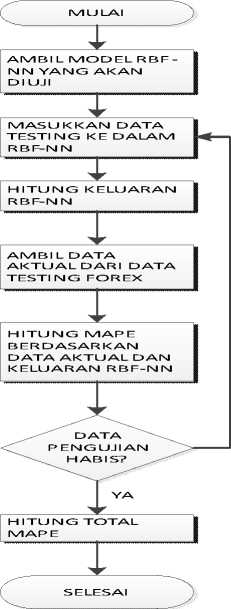 d. Setelah matrik w ditentukan, maka hasil perkalian mat-rik φ dan matrik w merupakan hasil peramalan atau keluaran dari sistem, sementara matrik t merupakan target yang harus dicapai. Penghitungan error (MAPE) dilakukan sesuai (5), jadi hasil perkalian φ dan w diambil sebagai nilai At , nilai Ft diambil dari matrik t, dan n sesuai jumlah data. Misalkan hasil peramalan ke-1 sampai ke-5 memberikan nilai : 1,1 ; 1,2 ; 1,3 ; 1,4 ; 1,5 dan nilai dari matrik t sebagai target ke-1 sampai ke-5 adalah : 1,2 ; 1,2 ; 1,3 ; 1,2 ; 1,5, maka nilai MAPE yang diperoleh :