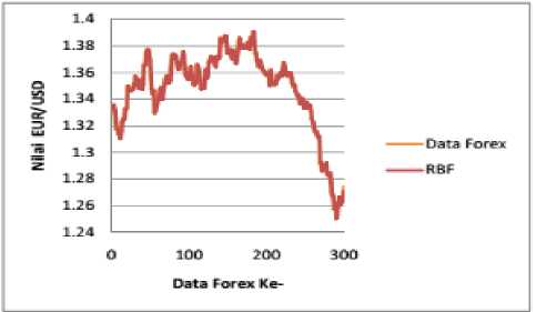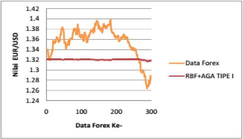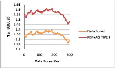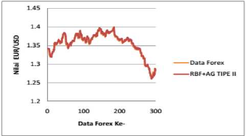 Kurva hasil peramalan AG II ditunjukkan pada Gambar 5, dan kurva hasil peramalan RBF-NN tanpa optimasi ditunjukkan pada Gambar 6. Seperti terlihat pada Gambar 6, kurva hasil peramalan berhimpit dengan kurva data forex aktual.