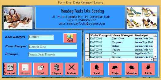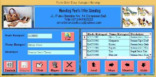 Pada gambar 11, field NmKategori diubah dari ‘Dress’ menjadi ‘Dress New’. Proses update ini mengubah data pada tabel Kategori di basis data Penjualan seperti gambar 12: